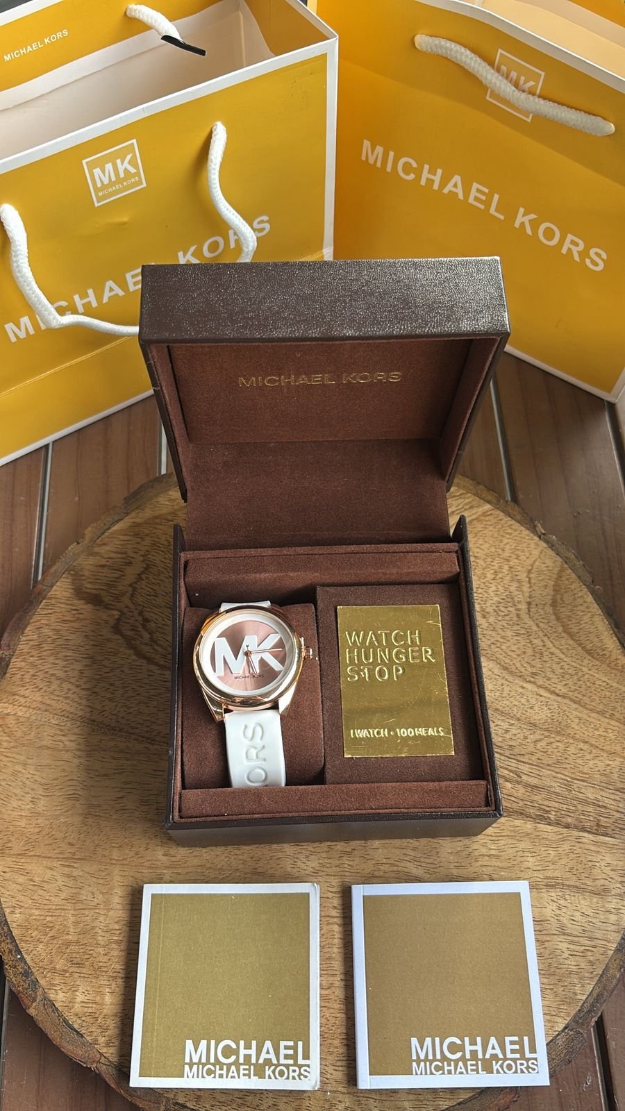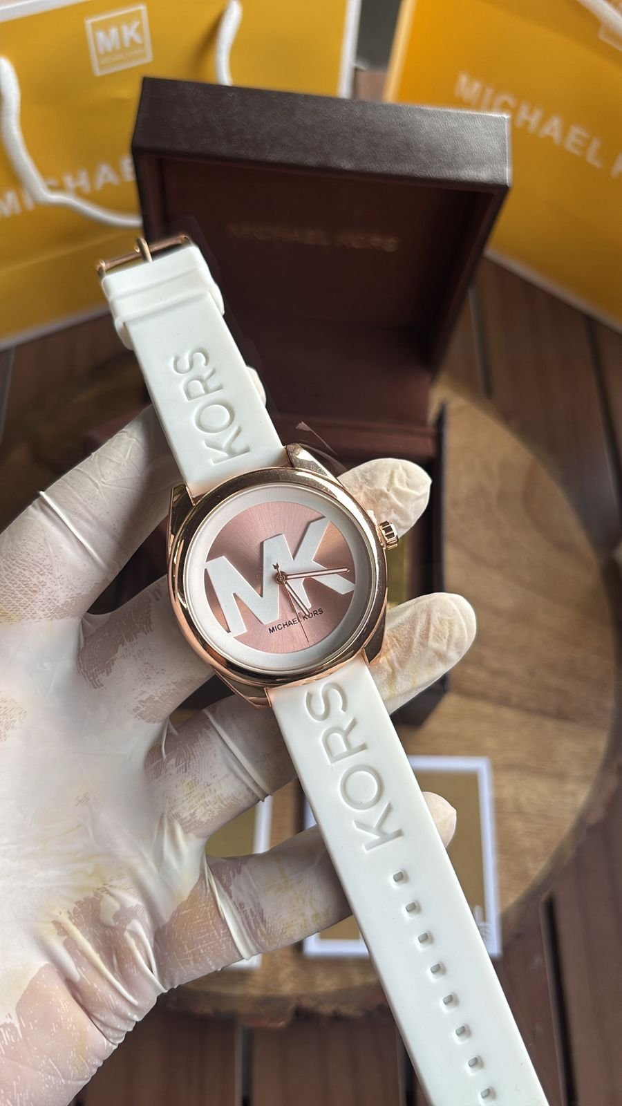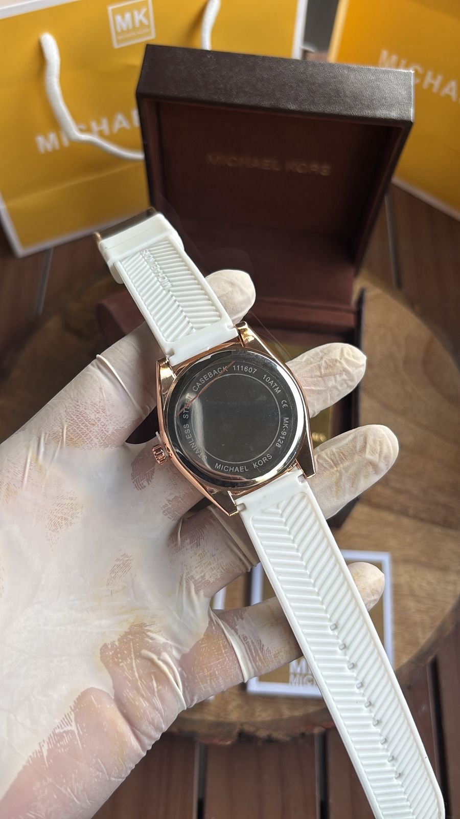 Authentic Branding: Genuine Michael Kors logos and markings on the watch, strap, and packaging.