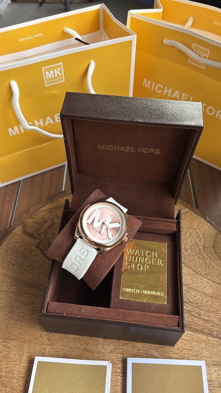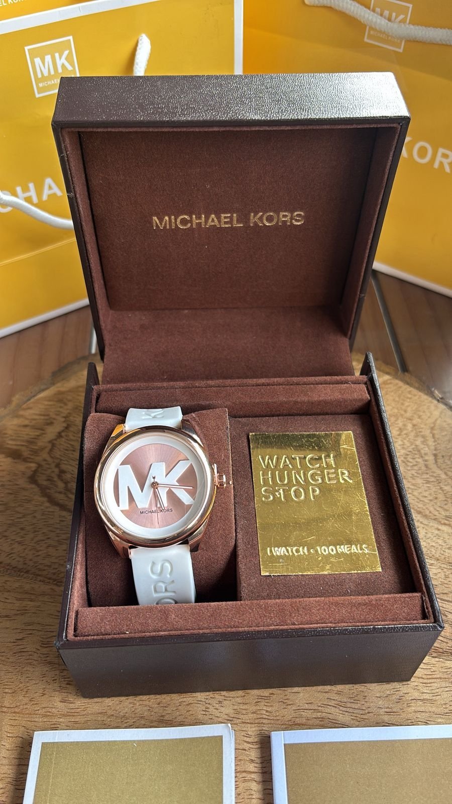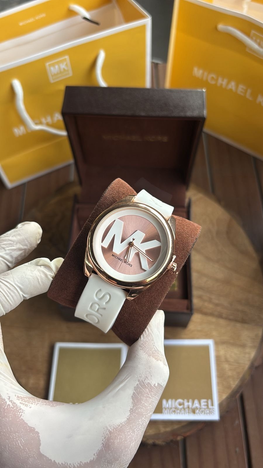 Authentic Branding: Genuine Michael Kors logos and markings on the watch, strap, and packaging.