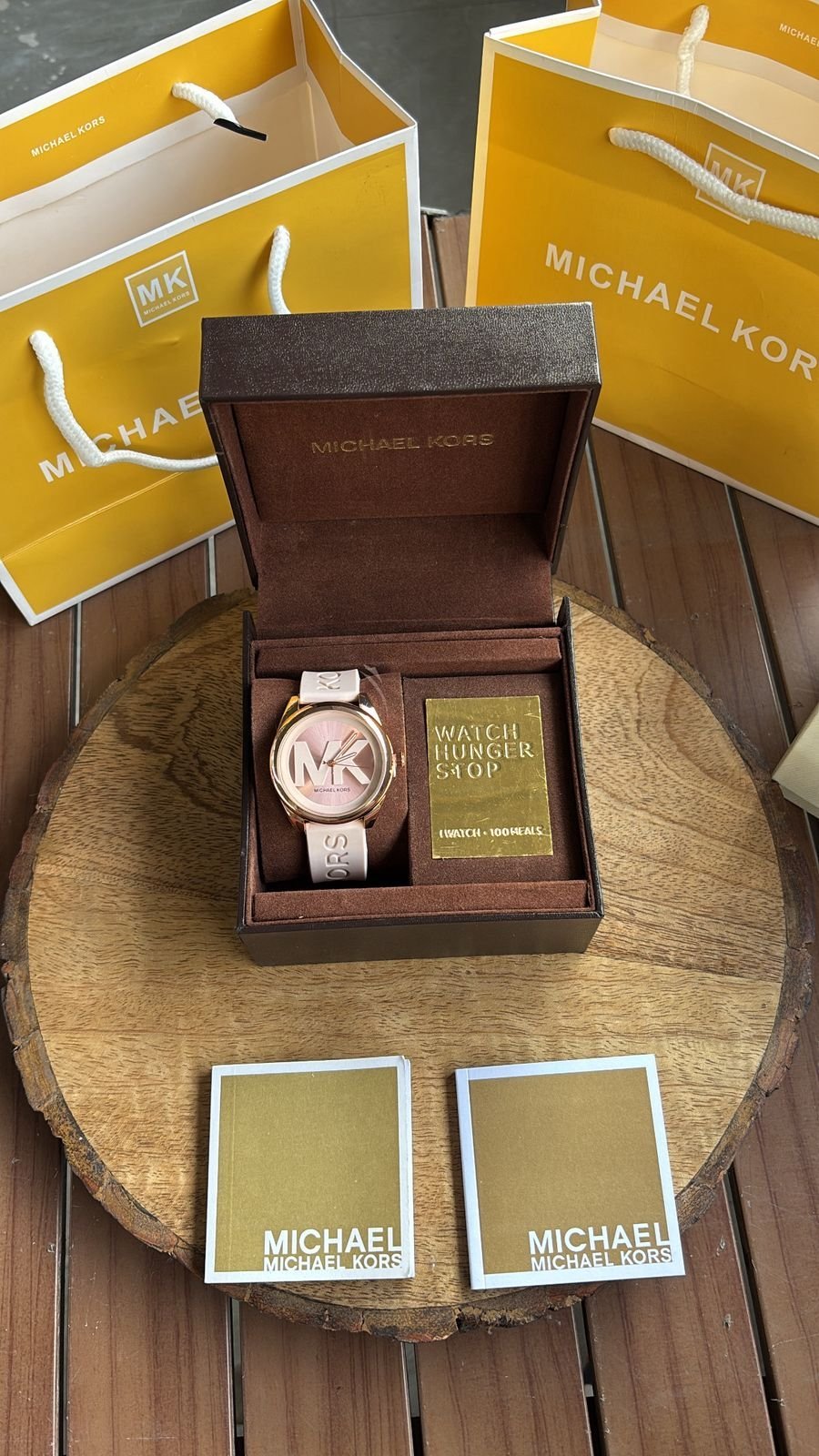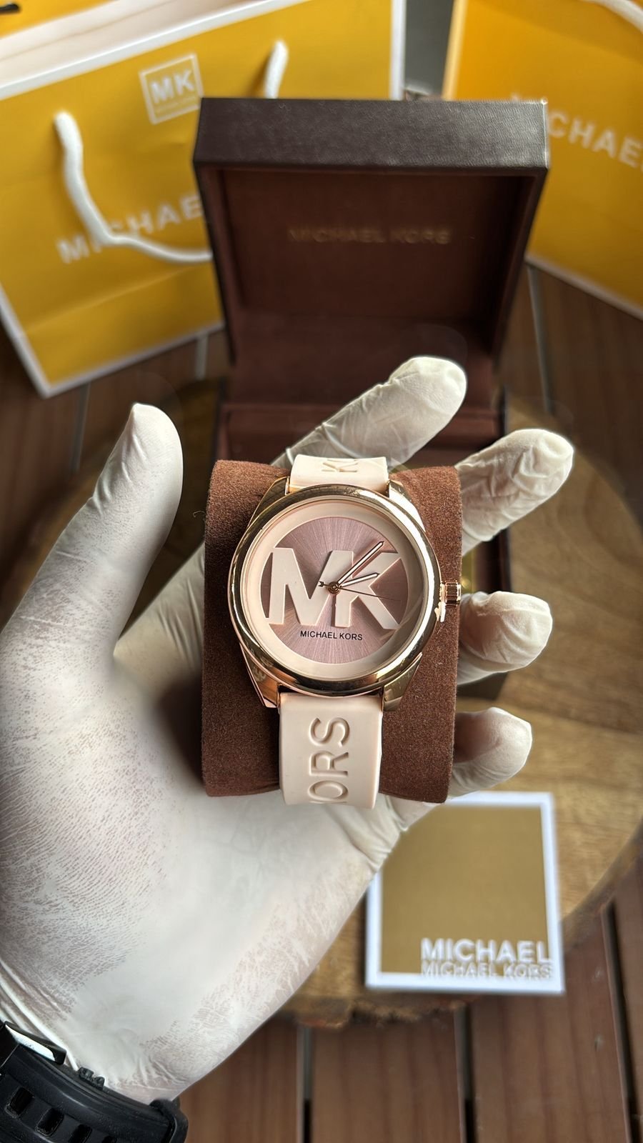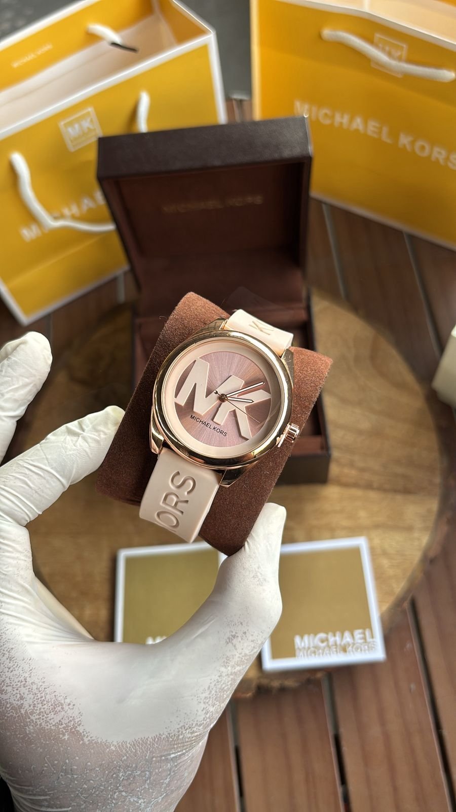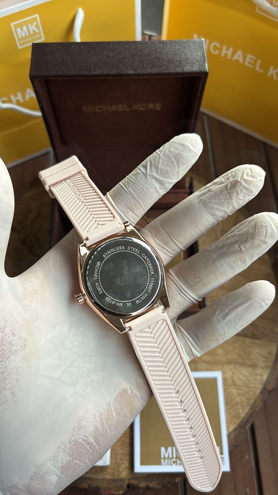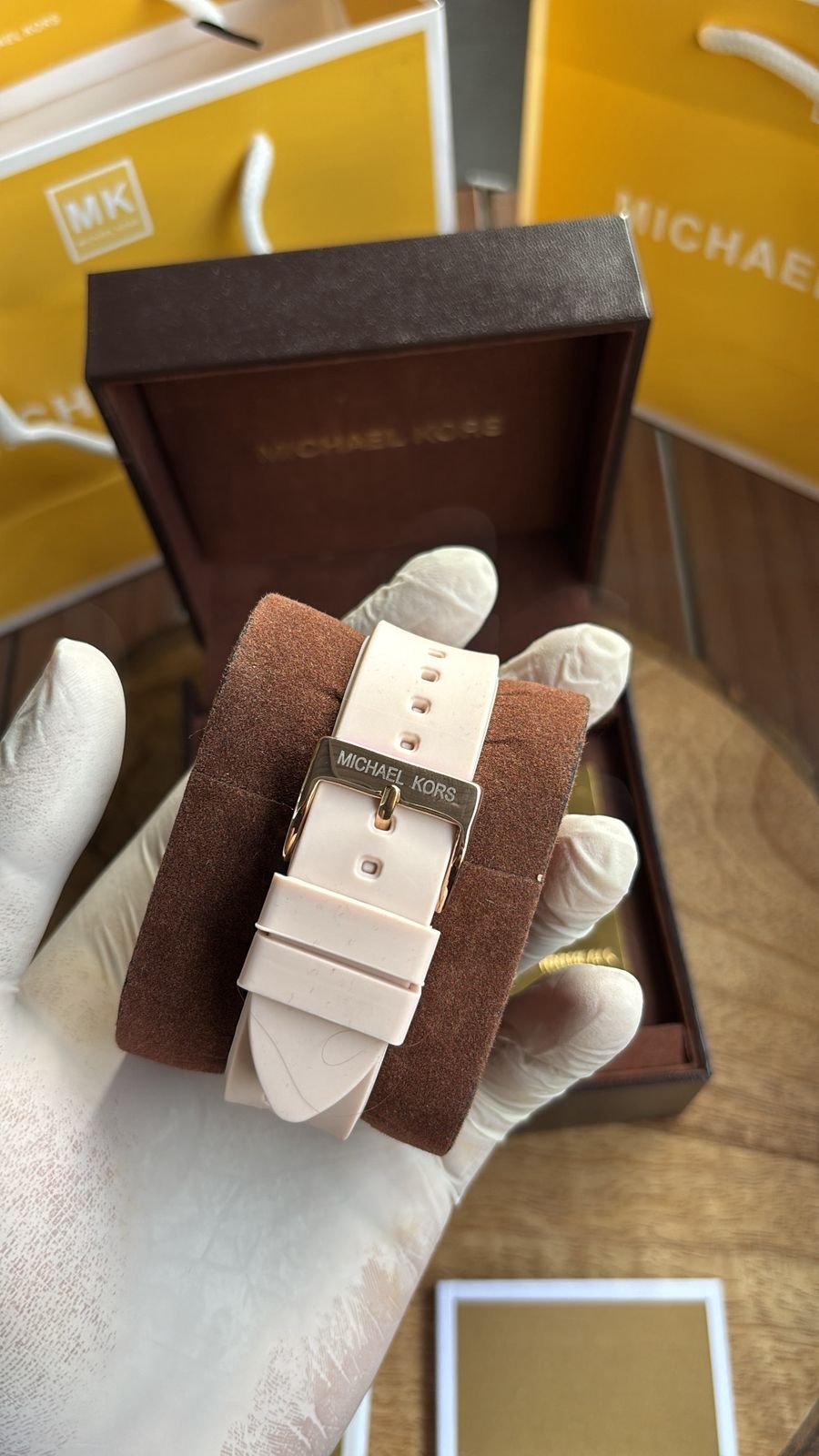 Authentic Branding: Genuine Michael Kors logos and markings on the watch, strap, and packaging.
