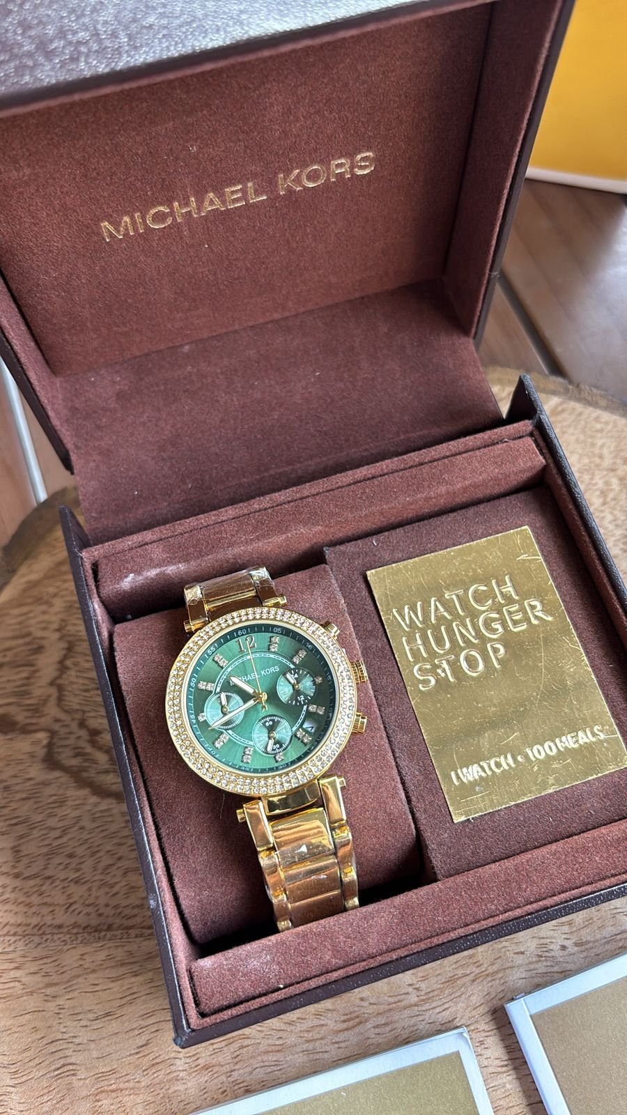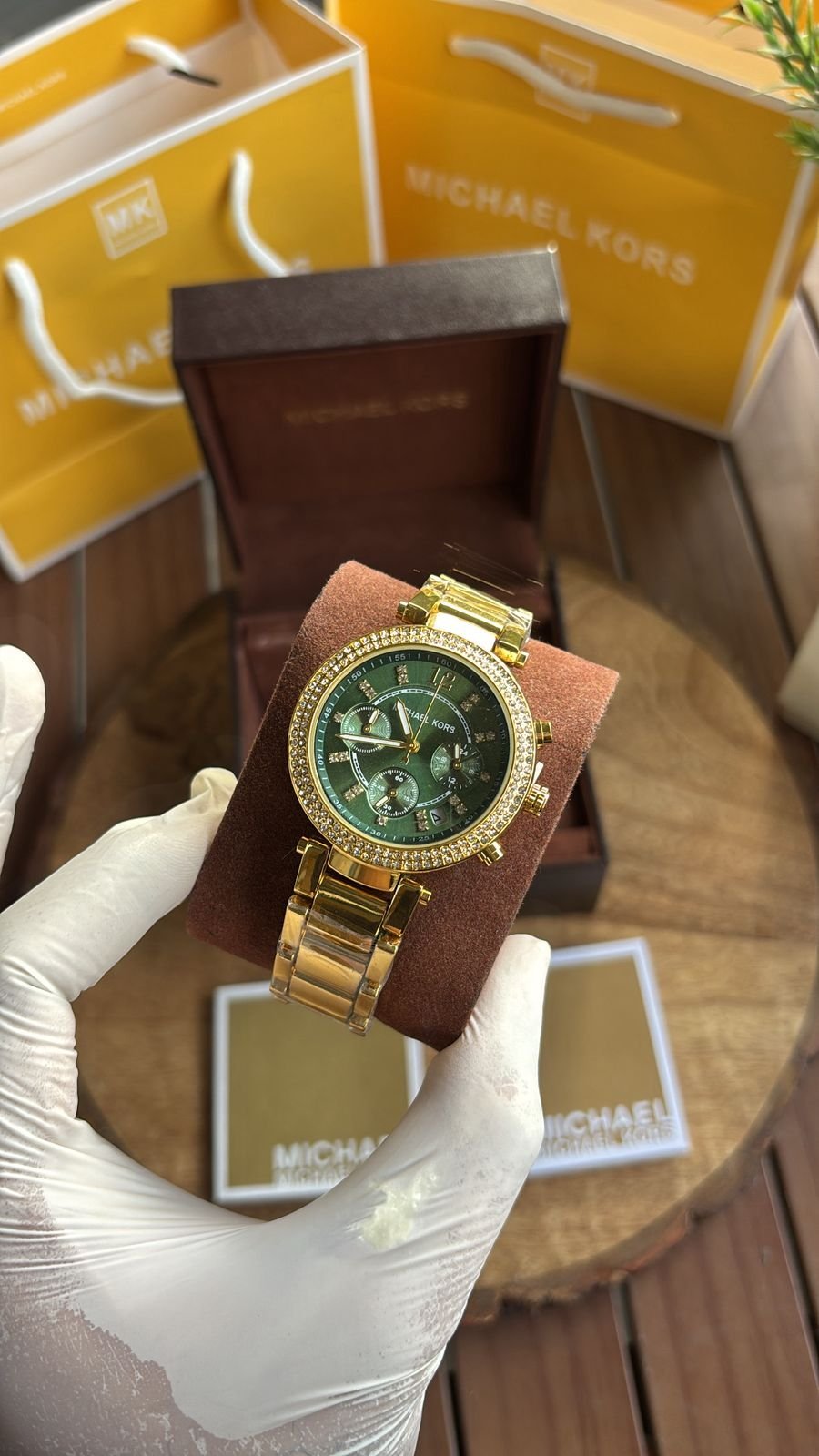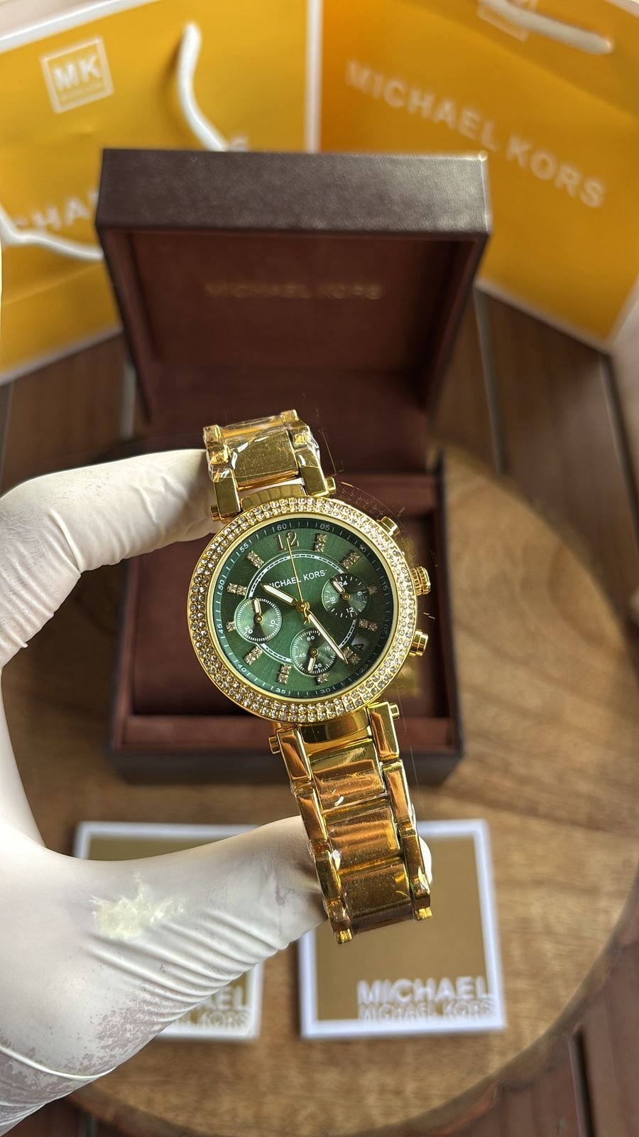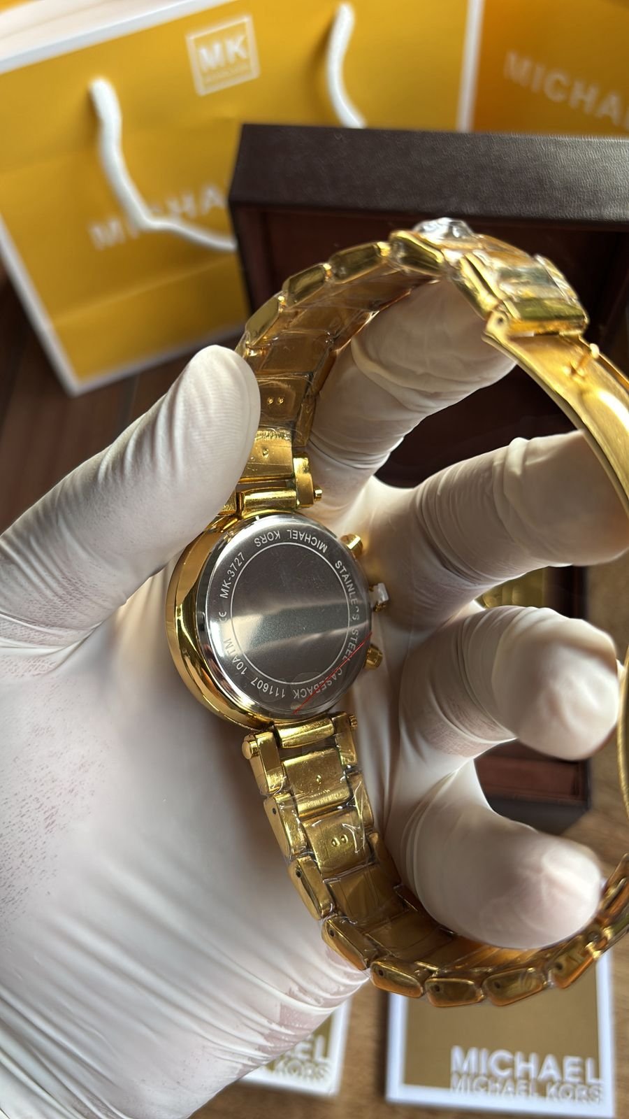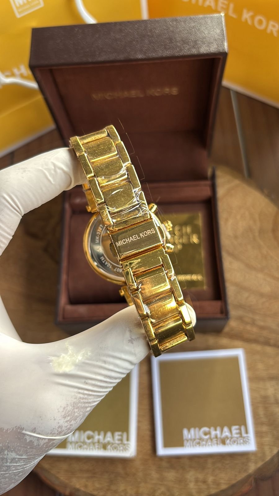 Authentic Branding: Genuine Michael Kors logos and markings on the watch, strap, and packaging.